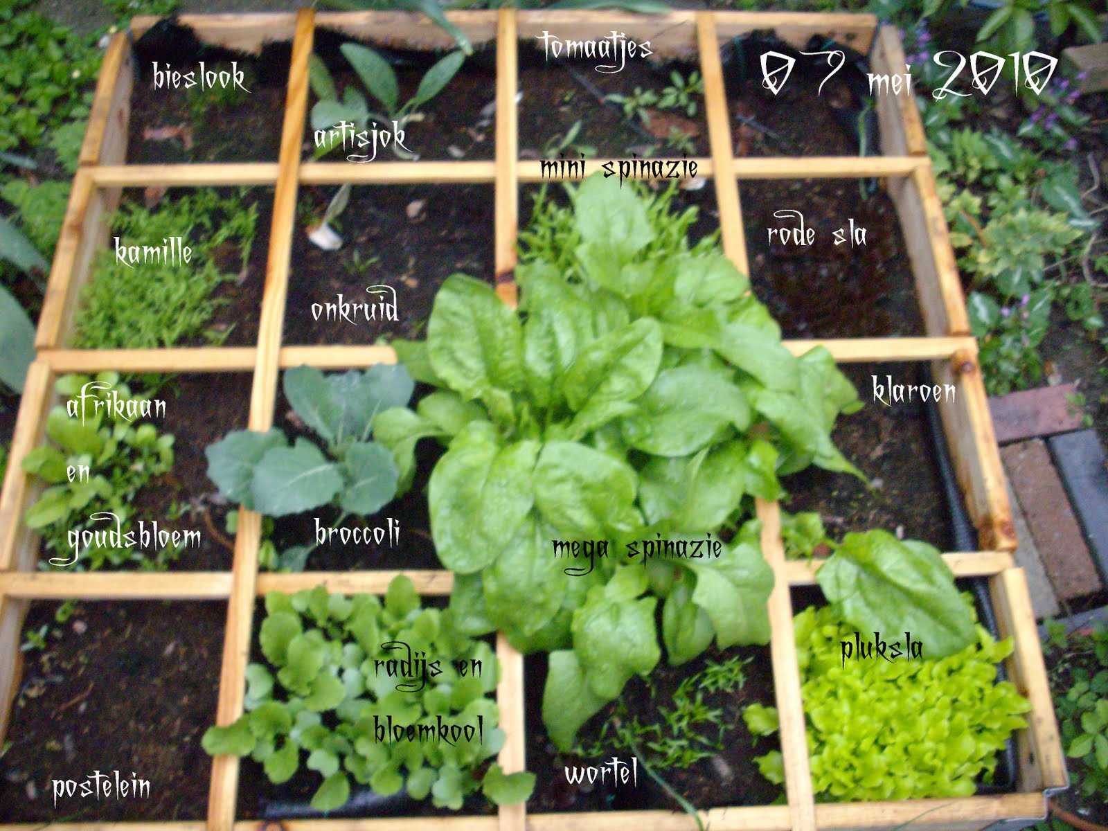 De andere kant staan de tomaten, broccoli en spinazie.